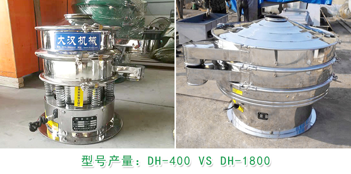 小產(chǎn)量選DH-400型振動篩:篩分直徑為350m/m,轉速1440r/min,功率為0.18kw,每小時處理量為80kg-150kg。