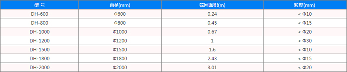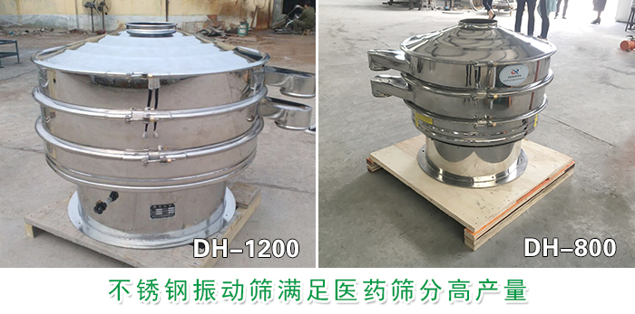 不銹鋼振動篩型號有DH-400、DH-600、DH-800、DH-1000、DH-1200、DH-1500、DH-1800、DH-2000等標(biāo)準(zhǔn)直徑型號,平均單次篩分醫(yī)藥物料產(chǎn)量可達(dá)1-5t,滿足醫(yī)藥篩分高產(chǎn)量的需求。還可根據(jù)需求特殊定制。