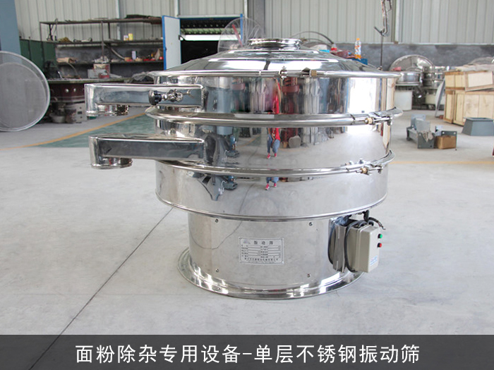 因?yàn)槊娣蹖儆谑称奉愇锪?,所使用?a href='http://m.hellononi.com/' target='_blank'>振動(dòng)篩必須衛(wèi)生、安全所以對(duì)于篩分要求比較高,在此小編為大家介紹一款面粉除雜專用設(shè)備-單層不銹鋼振動(dòng)篩: