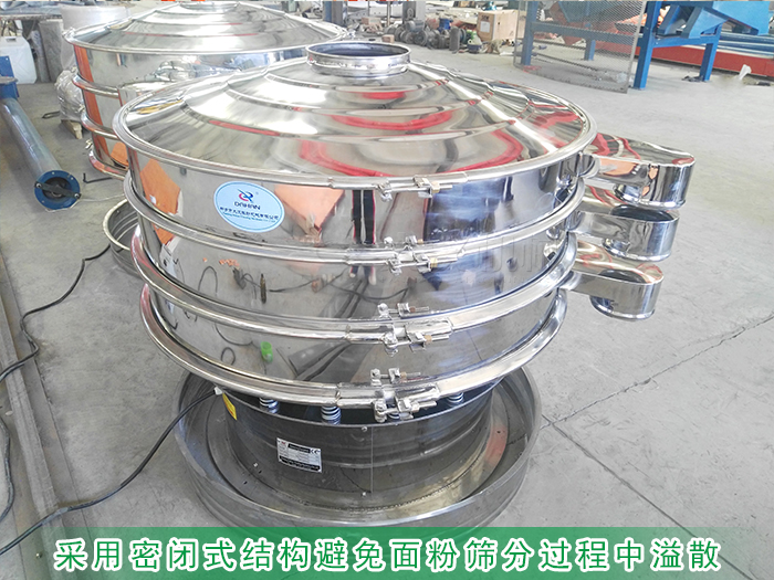 單層不銹鋼振動(dòng)篩整機(jī)采用密閉式結(jié)構(gòu),可以避免面粉在篩分過(guò)程中溢散,除了上部進(jìn)料口加裝有防塵蓋、篩框與篩網(wǎng)之間還有有密封膠圈、軟連接等進(jìn)行隔離和密封,有效防止灰塵進(jìn)入篩機(jī)內(nèi)部,所采用的密封件均為硅膠材質(zhì)符合食品行業(yè)的篩分要求。嚴(yán)格保證面粉在除雜的過(guò)程中干凈衛(wèi)生、不會(huì)受到污染。