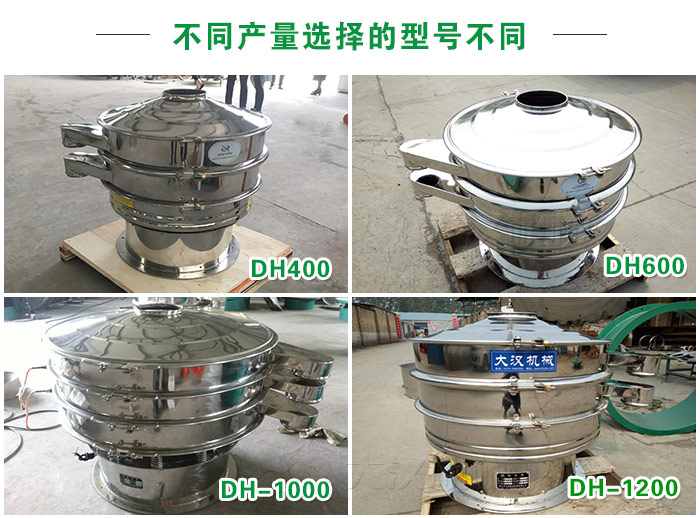 白砂糖不銹鋼振動(dòng)篩型號(hào)分為DH400、DH-600、DH-800、DH-1000、DH-1200、DH-1500、DH-1800、DH-2000等8種直徑型號(hào),根據(jù)客戶篩分白砂糖每小時(shí)不同的篩分產(chǎn)量,所選用的型號(hào)不同造成其價(jià)格是不同的,例如: