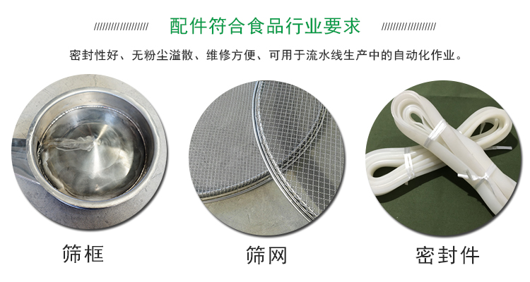 食品不銹鋼振動(dòng)篩所使用的配件如篩網(wǎng)、軟連接、密封件等,為了符合食品行業(yè)要求,篩網(wǎng)要采用高質(zhì)量的不銹鋼材質(zhì),軟連接與密封件要選擇硅膠材質(zhì),硅膠材質(zhì)的密封件具有良好的耐用性和衛(wèi)生性。