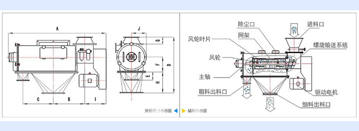 淀粉臥式氣旋篩由進(jìn)料口、除塵口、網(wǎng)籠、螺旋輸送系統(tǒng)、風(fēng)輪葉片、風(fēng)輪、主軸、驅(qū)動電機、粗料出料口、細(xì)料出料口組成。
