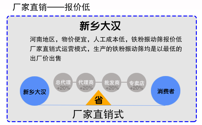新鄉(xiāng)大漢位于河南新鄉(xiāng),廠家眾多,競爭激烈,廠家之間不得不壓低價格形成價格優(yōu)勢,再加上新鄉(xiāng)地區(qū)物價低,人工成本低,所以鐵粉振動篩報價低,另外,大漢廠家采用廠家直銷式運營模式,生產(chǎn)的所有產(chǎn)品均是以低的出廠價出售,所以關(guān)于鐵粉振動篩價格方面的問題,用戶完全不必?fù)?dān)心,因為大漢廠家給出的報價是為合理的。